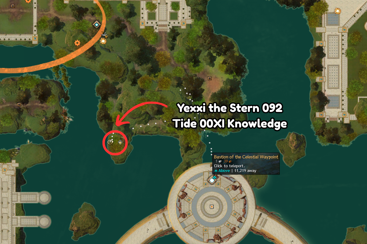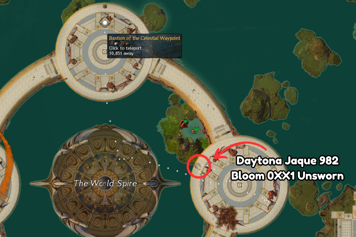 Go northwest from the Bastion of the Celestial Waypoint — [&BAoOAAA=] and look behind a pillar and some trees