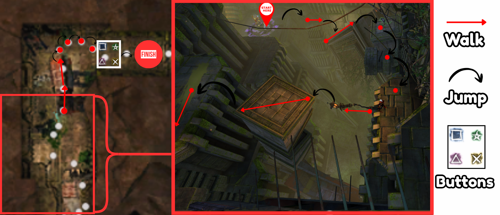 The jump across is intuitive, but follow the path outlined below. You will need 4 to get across to activate 4 buttons at the end
