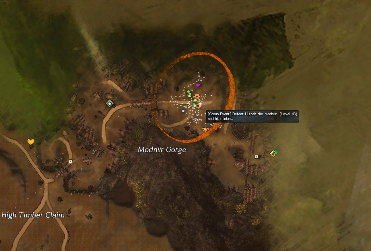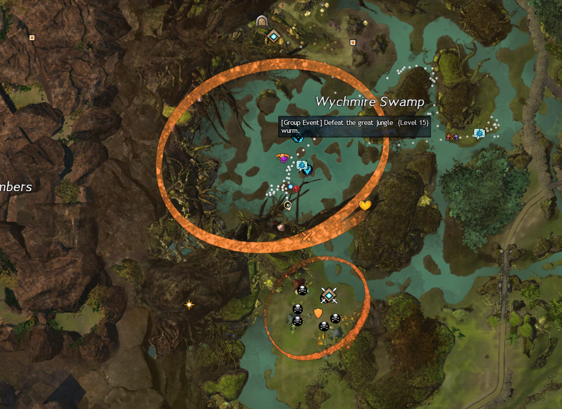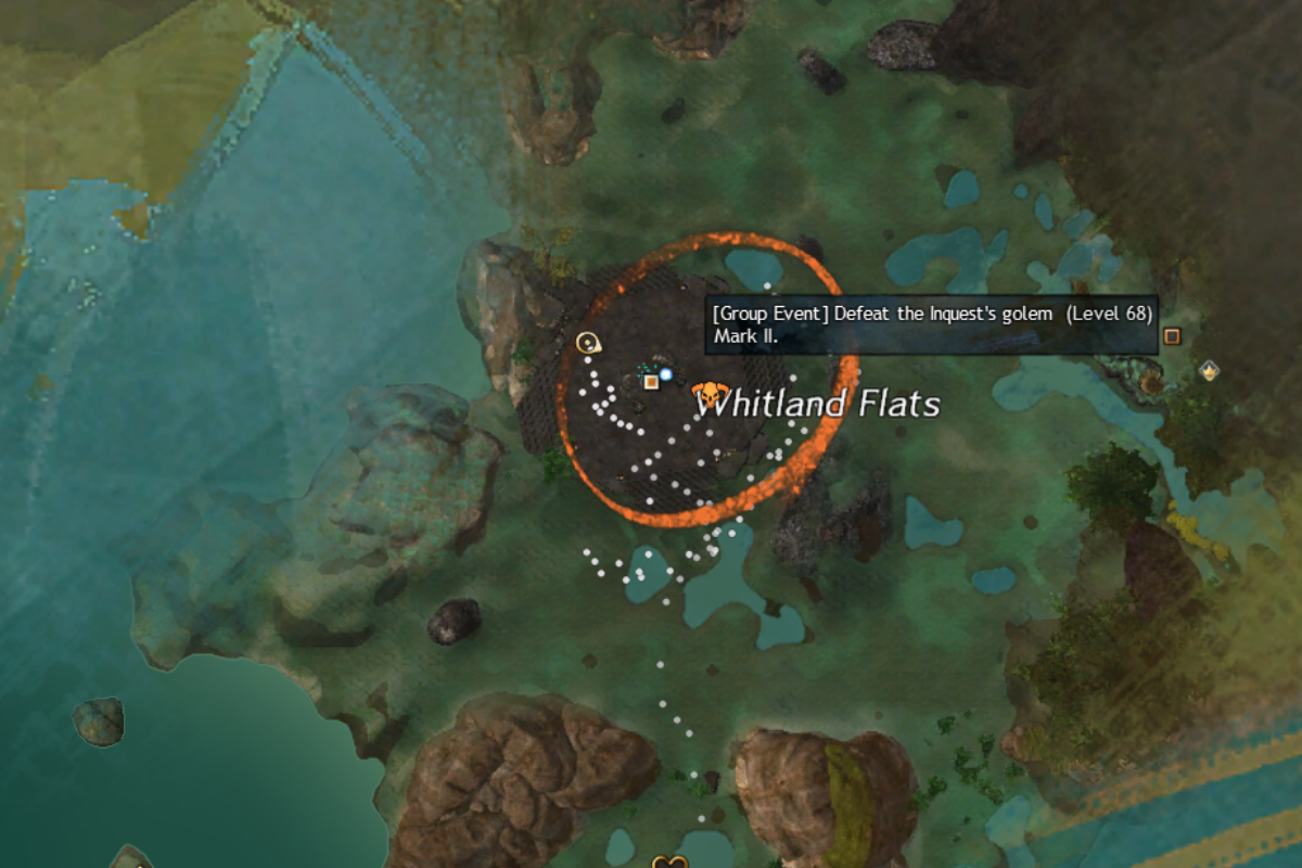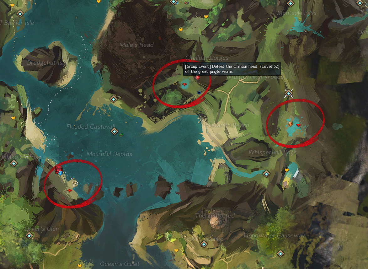 The event will spawn right on top of the Firthside Vigil Waypoint — [&BKoBAAA=] in Bloodtide Coast, where this will split in to three ways for Triple Trouble